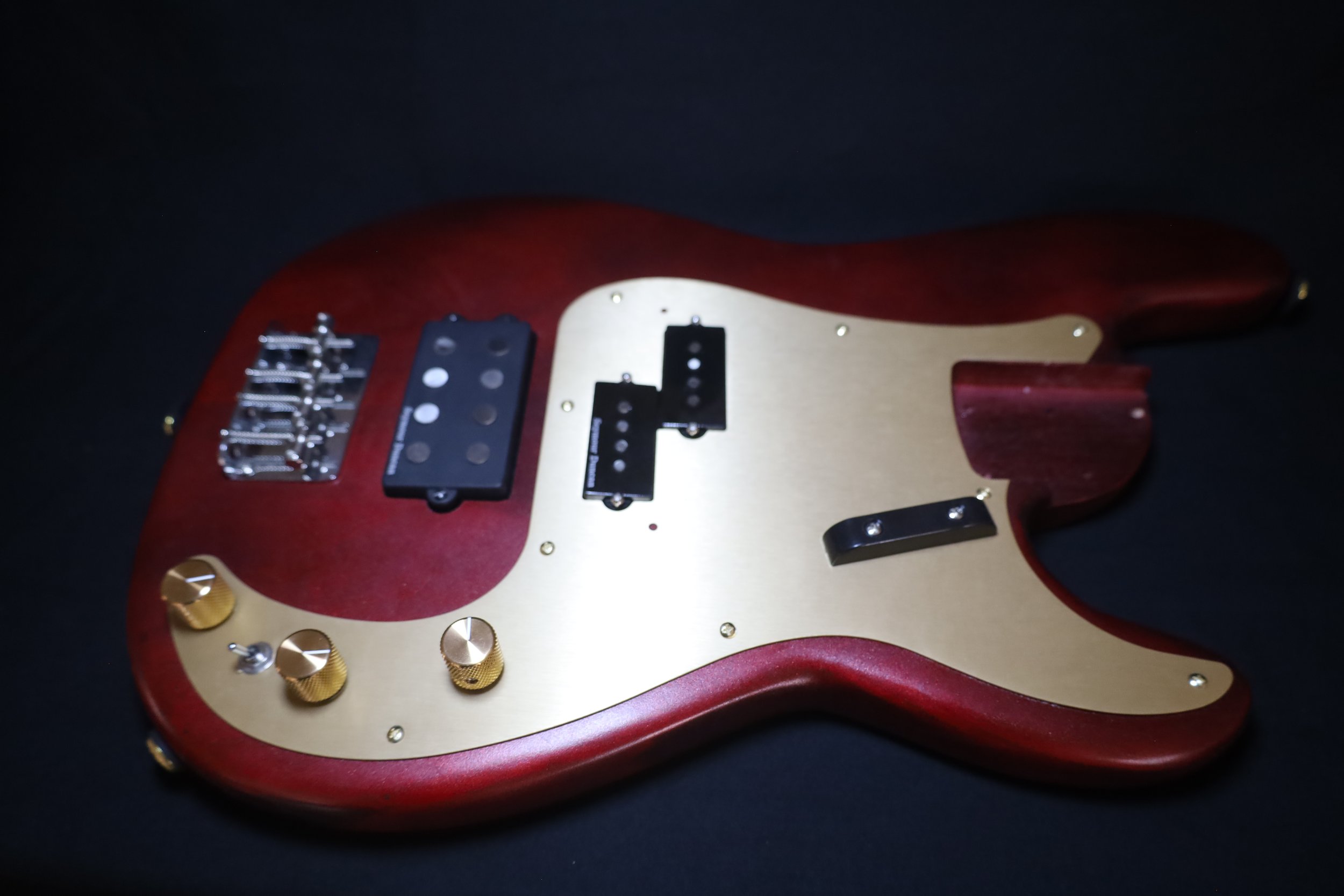 S.M. Wolk Guitars Hand Built body that fits Fender Bass necks.Features gold aluminum Guard, Seymour Duncan Antiquity P Bass Pickups, Duncan Music Man Pickup, 2 volumes, and 1 tone. There is a switch for single coil selection on the Music Man Pickup.